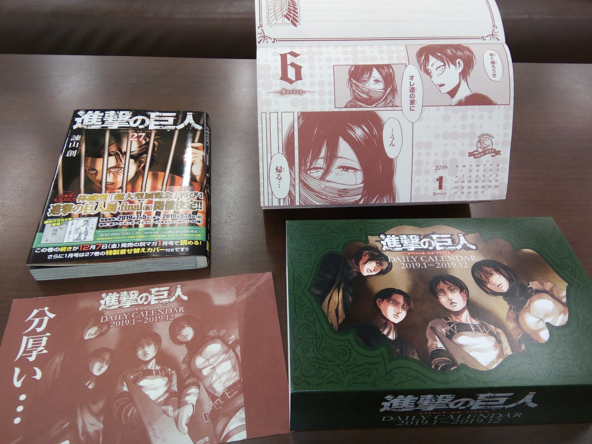 進撃の巨人 担当編集者バック 進撃の巨人 27巻発売中です 限定版は分厚い 365枚日めくりカレンダーつき もったいないけど会社にあるのを1枚だけめくってしまった 将来的に死んでくれ 5巻も本日発売です